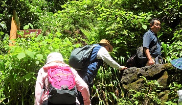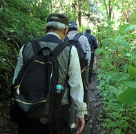 細い道を一列になって進む ベンチのある少し広い場所で休憩