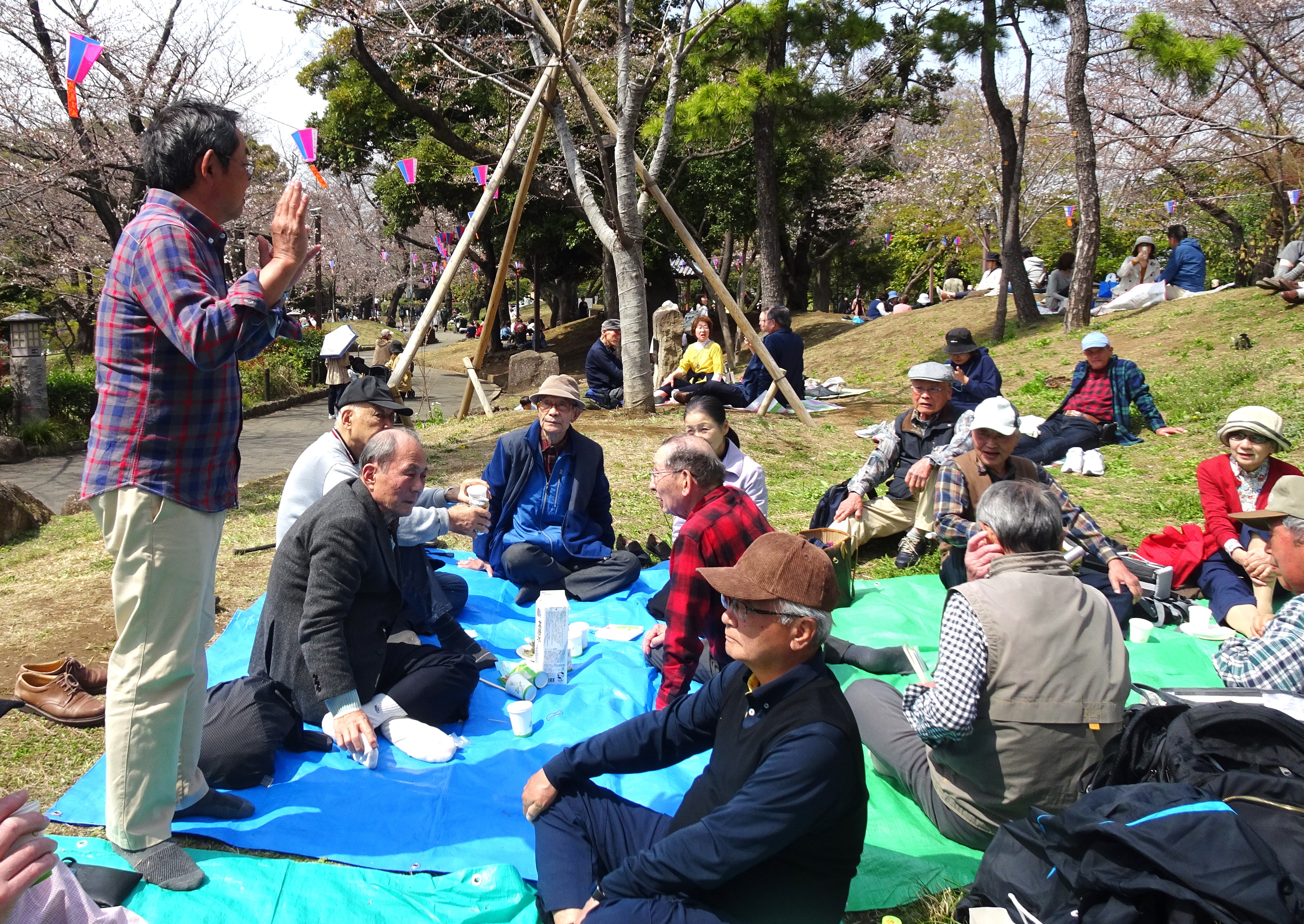 参加者は集合場所の王子駅中央改札口に11時前に全員集合。11時には飛鳥山公園の宴会場所に到着しました。早速記念撮影です。