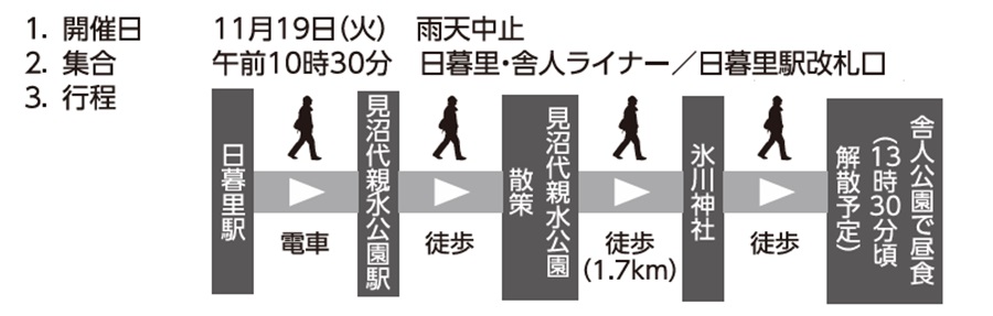 第48回散歩ING会は11月19日(火)、参加者12名が、舎人ライナー終着の足立区「見沼代親水公園駅」から「見沼代親水公園」を通って「舎人公園」まで約3.5Kmほど散歩しました。