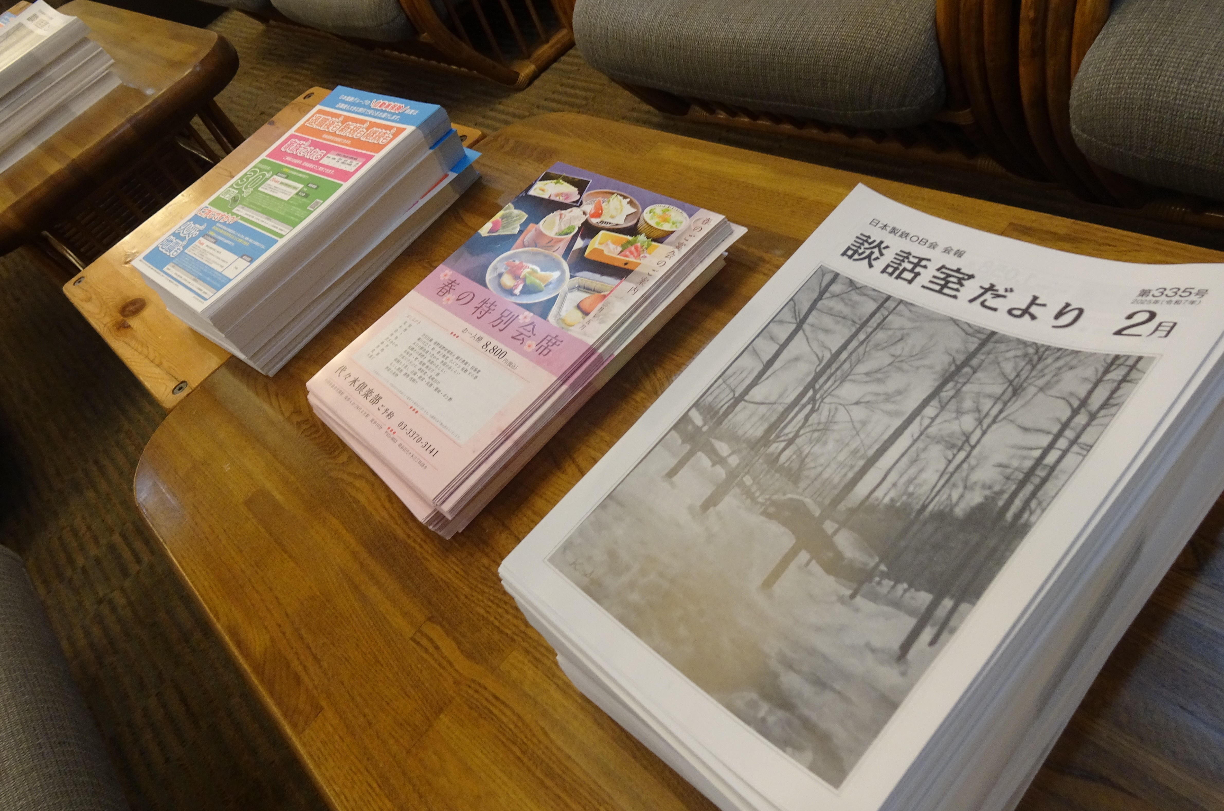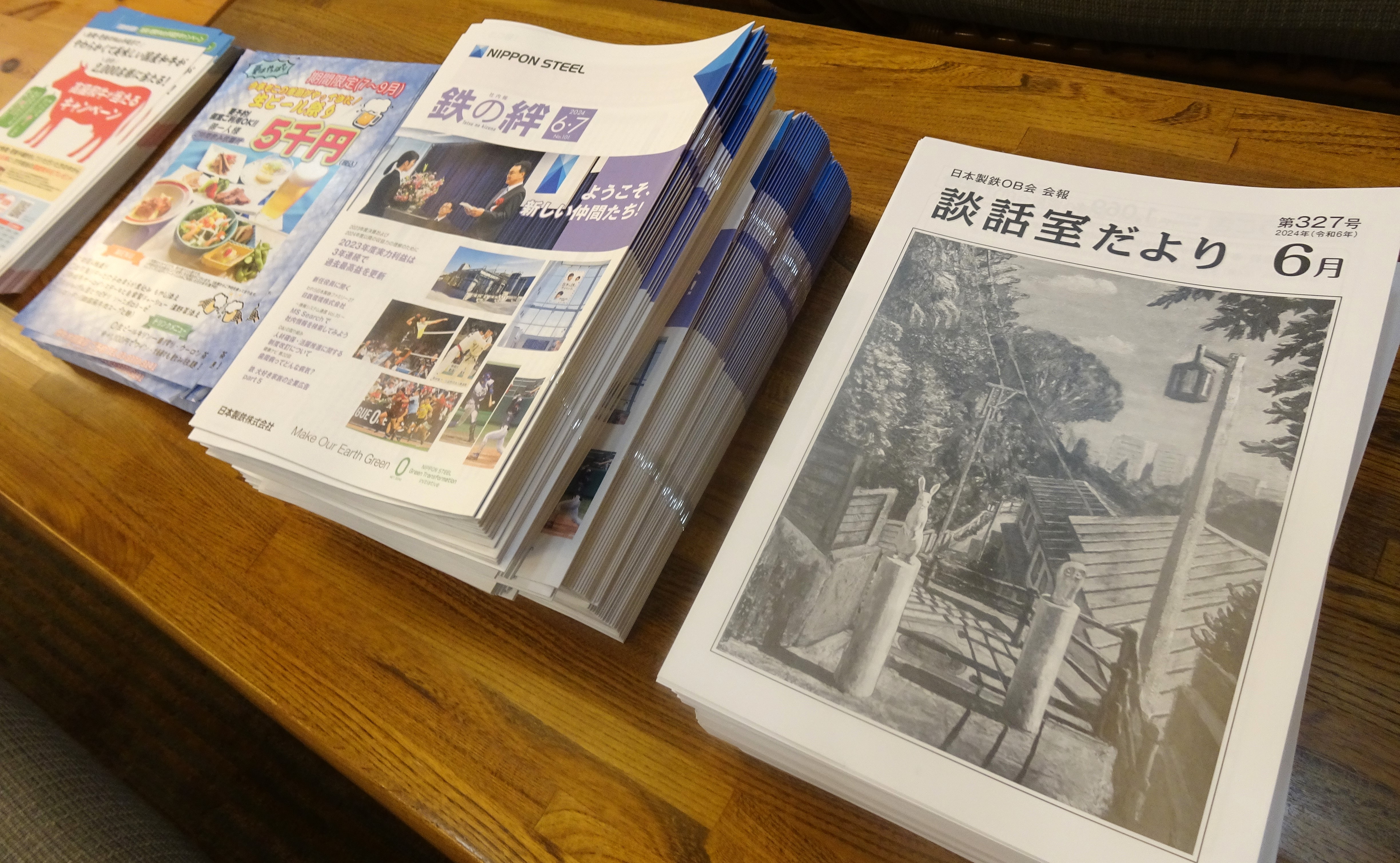 本日は、いつもの「談話室だより」の他に、日本製鉄の社内誌「鉄の絆」、代々木倶楽部レストランのチラシ2種の4点です。