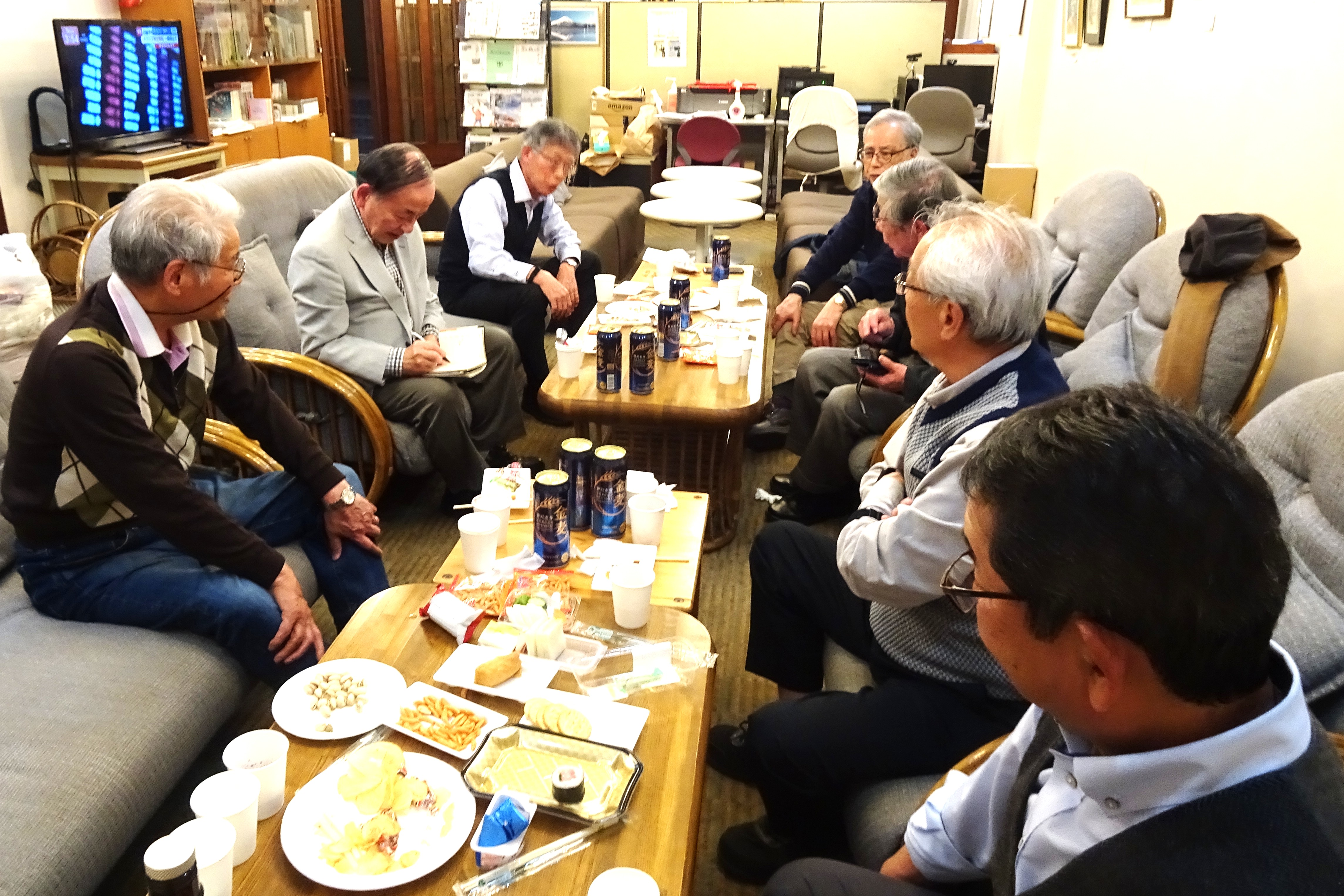 | 賀屋宣雄さんが談話室を来訪。 皆さんほとんどの方が旧知の仲のため懇談の輪に加わりました。 | |