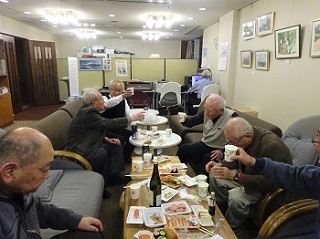 | 対戦後の懇親会 談話室に来訪のKさんも参加して乾杯!! |